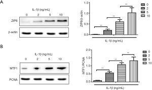Total cell proteins and nucleus proteins were isolated separately, and ZIP8 and nuclear MTF1 expression were examined by western blot analysis. As shown in Figure 3, the total expression of ZIP8 (Figure 3A) and the amount of MTF1 in the nucleus (Figure 3B) were induced by IL-1β treatment. The enhanced expression of ZIP8 and MTF1 were IL-1β dose-dependent. This indicates that IL-1β promotes the expression of ZIP8 in NP cells and subsequently MTF1 nuclear translocation, suggesting that the IL-1β/ZIP8/MTF1 signaling pathway plays a role in NP cells.
