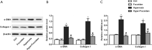 Primary lung fibroblasts were seeded into a 6-well plate and treated as before. Then, cells were homogenized in the RIPA buffer, holding 1% PMSF on the ice for 30 minutes. After centrifugation at 12,000 ×g for 15 minutes, the supernatant was collected, and protein concentration was detected using BCA protein assay reagent (Solarbio, Beijing, China). Afterward, 10% SDS-PAGE separated proteins and transferred to PVDF membranes (Millipore, Billerica, MA). Membranes were blocked with 5% non-fat milk for 1.5 hours. After washing, proteins were incubated with anti-Bcl-2, anti-Bax, anti-α-SMA, and anti-Collagen I (Abcam, Cambridge, UK) overnight at 4 °C. After washing with TBST, these membranes were then incubated with horseradish peroxidase-labeled antibody (Abcam) for 1 hour at room temperature. Immunoreactive bands were measured using ECL reagents.