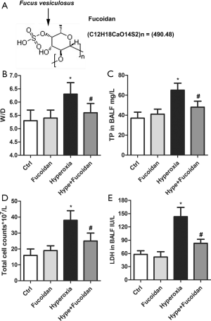 The structure of fucoidan was illustrated in Figure 1A. Hyperoxia-exposed newborn rats were treated with fucoidan to explore the effect of fucoidan on hyperoxia-induced lung injury. As shown in Figure 1B, fucoidan treatment remarkably decreased the elevated lung W/D weight ratio induced by hyperoxia. Besides, the TP content, total cell counts, and LDH level of BALF were significantly reduced in the Hype + Fucoidan group compared with the Hyperoxia group (Figure 1C,D,E). These results showed that fucoidan treatment could remarkably attenuate hyperoxia-induced lung injury.