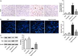Hyperoxia-exposed rats and cultured primary lung fibroblasts were treated with fucoidan to detect whether fucoidan treatment could reduce cell apoptosis. As illustrated in Figure 3A, TUNEL assay suggested hyperoxia-induced cell apoptosis in lung tissues was remarkably suppressed by fucoidan treatment. Besides, the apoptosis of cultured lung fibroblasts was significantly decreased in the Hype + Fucoidan group compared with the Hype group (Figure 3B). Moreover, the Bcl-2/Bax ratio was elevated in the Hype + Fucoidan group compared with the Hype group (Figure 3C). These results strongly showed that fucoidan could tremendously reduce cell apoptosis in hyperoxia-exposed lung tissues and cultured primary lung fibroblasts.