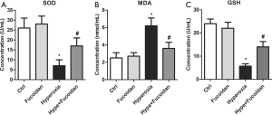 To explore whether fucoidan treatment could alleviate oxidation reactions, the level of serum SOD, MDA, and GSH was measured in hyperoxia-exposed newborn rats using ELISA. Results suggested that SOD and GSH level was significantly elevated in Hype + Fucoidan group compared with Hype group (Figure 4A,B,C). In addition to this, hyperoxia-induced, the increase in the level of MDA was remarkably repressed by fucoidan therapy (Figure 4B). These results suggested that oxidative stress induced by hyperoxia could be remarkably improved by fucoidan treatment.