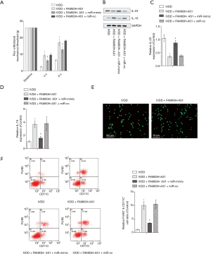 Next, we explored the role of FAM83H-AS1/miR-22-3p in inflammatory pain. The IVDD-induced mechanical hyperalgesia was lowered due to highly expressed FAM83H-AS1 and overexpression of miR-22-3p, which led to the recovery of the mechanical withdrawal threshold (Figure 5A). Likewise, IL-23 levels were diminished and the expression of IL-10 was increased in IVDD model mice when FAM83H-AS1 was overexpressed. Subsequently, upregulation of miR-22-3p abrogated the function of FAM83H-AS1 in the expression of IL-23 and IL-10 (Figure 5B,C,D). Cells extracted from IVD tissues were morphologically consistent with macrophages, and the significant expression of CD68 further validated that macrophages were successfully isolated (Figure 5E). Flow cytometry analysis demonstrated that the proportion of macrophages positive for F4/80+CD11C+ in the IVDD group was elevated by overexpression of FAM83H-AS1, and miR-22-3p upregulation recovered the ratio of positive F4/80+CD11C+ macrophages (Figure 5F). Overall, FAM83H-AS1 ameliorated inflammatory responses in IVDD through sponging miR-22-3p.