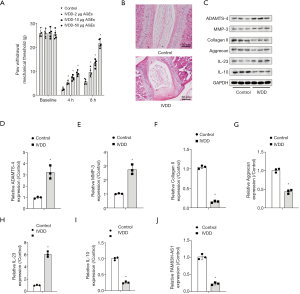 Total protein was isolated from tissues using lysis buffer (Beyotime, China). The equivalent protein samples were separated on 10% SDS-PAGE gels, then transferred to PVDF membranes (Bio-Rad, USA). Following blocking in 5% skim milk, membranes were incubated overnight with primary antibodies at 4 °C, appropriate secondary antibodies for 1 hour at 37 °C, then treated with Amersham ECL Western Blotting System (Amersham Pharmacia, USA). The following primary antibodies were used: ADAMTS-4 (Abcam# ab219548), MMP-3 (Cell signaling#14351), collagen II (Thermal Fisher #MA5-13026), aggrecan (Thermal Fisher #MA5-16888), IL-23 (Thermal Fisher # 16-7123-81), IL-10 (Thermal Fisher # MA5-23796), and GAPDH (Cell signaling #5174). GAPDH was used as an internal control.