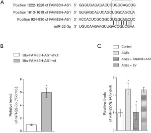 With the aid of bioinformatics analysis, we found that FAM83H-AS1 harbored the potential binding sites for miR-22-3p (Figure 3A). RNA pull down assay demonstrated that miR-22-3p was only abundantly enriched in complexes pulled down by wild type FAM83H-AS1 in contrast with mutant FAM83H-AS1 precipitates, validating that miR-22-3p directly bound to FAM83H-AS1 (Figure 3B). Results of qRT-PCR assay showed that the expression of miR-22-3p was enhanced by AGEs treatment, and that the restoration of miR-22-3p levels occurred due to overexpression of FAM83H-AS1 (Figure 3C). Overall, FAM83H-AS1 negatively regulated miR-22-3p expression via directly binding with it.