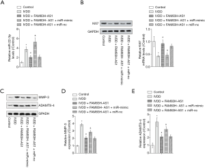 To confirm whether the function of FAM83H-AS1 was mediated by miR-22-3p, we carried out rescue experiments. As shown in Figure 4A, the increased miR-22-3p expression in the IVDD model group was recovered by overexpression of FAM83H-AS1, then elevated by upregulation of miR-22-3p. Western blot revealed that the decline in Ki67 levels caused by IVDD was reversed by ectopic expression of FAM83H-AS1, and overexpression of miR-22-3p contributed to the restoration of Ki67 expression (Figure 4B). Moreover, elevated ADAMTS-4 and MMP-3 expression resulting from IVDD was reduced by FAM83H-AS1 upregulation, and subsequent overexpression of miR-22-3p partially counteracted the effects of FAM83H-AS1 on the protein levels of ADAMTS-4 and MMP-3 (Figure 4C,D,E). Taken together, these findings indicated that FAM83H-AS1 functioned as a regulator of IVDD via modulation of miR-22-3p.