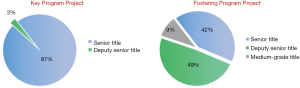 Of the applicants who received funding through the Key Program, 141 were in a senior level position (such as professor, researcher, and chief physician) and only 4 were in deputy senior level positions (associate professor and associate chief physician). Among those funded through the Fostering Program, 84 applicants were in a senior level position (such as professor, researcher, and chief physician), 98 were in a deputy senior level position (including associate professor, associate chief physician and associate chief pharmaceutist), and 19 had a medium-grade professional title (including lecturer, assistant, physician in charge and pharmaceutist in charge), as illustrated in Figure 7.