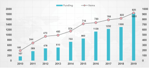 Between 2010 and 2019, the funding allocated through the Joint Fund rose from 167 million CNY to 1.85 billion CNY, with an average annual increase of 187 million; and in the same period, the number of funded projects increased from 195 to 925, with an average annual increase of 81, as illustrated in Figure 1.