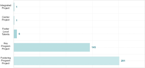 From 2015 to 2019, the NSFC received 3,197 applications and funded 354 population health projects from the Joint Funds. Table 2 shows the detailed information from each year. As shown in Figure 2, NSFC supported 201 Fostering Program projects, 145 Key Program projects, 6 Foster Local Talent projects, 1 Center project, and 1 Integrated project.