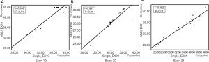 According to the sequencing results, 13 mutant- and 7 wild-type tissue samples were chosen for comparison of the performance of multiplex and singleplex assays at each site. The 13 mutant-type samples included 6 samples with exon 19 deletion, 2 samples with exon 20 T790M and 6 samples with exon 21 L858R, within which a sample contained the exon 19 deletion (c.2235_2249del-15) and exon 20 T790M simultaneously. The wild-type samples were randomly chosen from all wild-type samples. These 20 samples were amplified respectively by singleplex and multiplex assays concurrently and the data were statistically analyzed by Pearson correlation analysis and Bland-Altman method to test the consistency of performance.