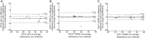 To further investigate the consistency of the singleplex and multiplex assays, the Bland-Altman method was applied (Figure 6). The analysis and diagram process were conducted in MedCalc 18.5 (MedCalc Software Ltd.). As the plot shows, the mean difference of every mutation was close to zero, which revealed low deviation, while most spots were aggregated within the 95% confidence interval of consistency. In conclusion, the singleplex and multiplex assays were highly accordant.