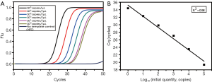After optimizing the PCR ingredient and thermal cycling conditions, we used serially diluted plasmids (range, 100–106 copies) to test the limit of detection (LOD). To determine the sensitivity of this assay, serially diluted mutant-type plasmids (range, 100–105 copies) were 1:1 mixed with 330 ng human genomic DNA (293T cell line) to generate mixed templates containing 0%, 0.001%, 0.01%, 0.1%, 1%, 10%, and 50% mutant DNA respectively. Each sample was analyzed in triplicate. After the determination of sensitivity, the cycle number would be used to calculate the threshold and when a clinical sample’s Cq (quantification cycle) was larger than the threshold, it would be called wild-type.