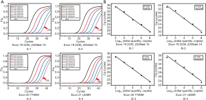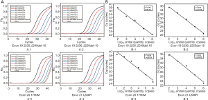 The concentration of tissue sample DNA ranged from 20.87 to 779.89 ng/µL, and all were diluted to 20 ng/µL for screening. By comparing the Cq of samples and the standard curve (Figure 1), the copy number of ctDNA could be quantified. The concentration range of ctDNA was 104–103 copies/µL.