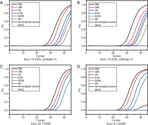 - Zhu L, Zhang S, Xun Y, et al. Comparison of the Amplification Refractory Mutation System, Super Amplification Refractory Mutation System, and Droplet Digital PCR for T790 M Mutation Detection in Non-small Cell Lung Cancer after Failure of Tyrosine Kinase Inhibitor Treatment. Pathol Oncol Res 2018;24:843-51. [Crossref] [PubMed]