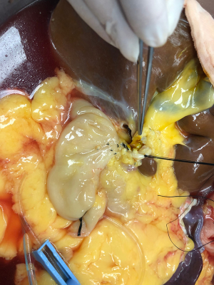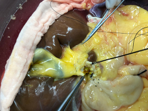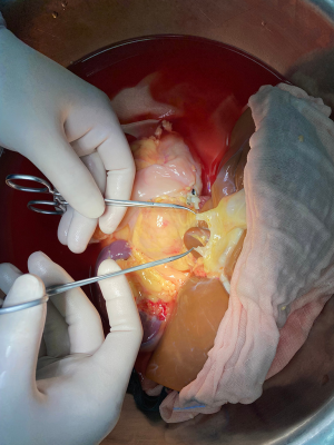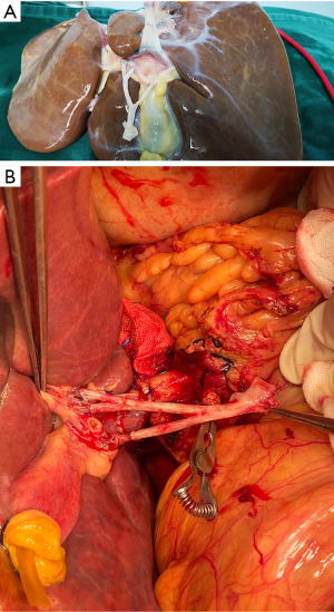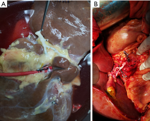After routine en bloc acquisition of the donor liver, pancreas, and both kidneys, the abdominal aorta was cut between the renal artery and the SMA, the inferior vena cava was transected below the liver and above the right renal vein, the donor pancreas and liver were preserved, and the renal junction kidney group was trimmed. The surrounding tissues, including lymphatic vessels, the hepatic plexus, and surrounding connective tissue, were carefully dissected at the hepatic pedicle at the first porta hepatis. The common bile duct, hepatic portal vein, and PHA were freed from the right to the left, respectively. The distal part of the common bile duct was transected and doubly ligated with no. 7 and 4 silk sutures, the hepatic portal vein was transected approximately 1.5–2 cm away from the outlet of the pancreas, and the PHA was freed in the direction of the pancreas. The common hepatic artery and gastroduodenal arterial arch could be observed, the arterial variation was explored, then the integrity of the arterial arch was obtained. The PHA was transected approximately 0.5 cm away from the distal end of the arterial arch, the PHA transection was closed with a 5-0 atraumatic vascular suture, and the opening of the donor liver end was examined (Figure 1). If the hepatic artery was variant, the variant hepatic artery branches were divided separately (Figures 2 and 3). The SMA and its branches were obtained for liver reserve (Figure 4).