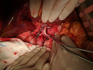 The donor liver was trimmed in vitro and revascularization was performed. After trimming the SMA and its branches and selecting the appropriate branches, the hepatic artery and SMA branches were end-to-end sutured with appropriate atraumatic vascular sutures, fixed at 4 points, then intermittently sutured. The reconstructed artery was then anastomosed end-to-end with the hepatic artery in vivo (Figures 5 and 6). If the PHA of the donor liver was not variable but short, end-to-end anastomosis was performed with the SMA and the PHA of the donor liver in vitro, and end-to-end anastomosis was performed between the SMA of the donor and the PHA of the recipient liver after the portal vein was opened (Figure 7).