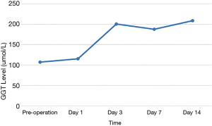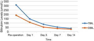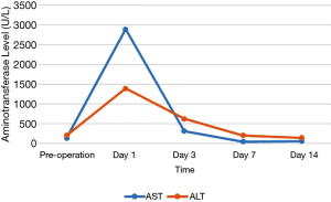 Of the 17 recipients, 14 were male and 3 were female, aged between 27 to 56 years. The MELD scores ranged from 1 to 35, and the Child-Pugh classifications were A to C. A total of 15 cases were modified piggyback liver transplantations, and 2 cases were classical piggyback liver transplantations. The intra-operative hemorrhagic volume was 300–6,000 mL, blood transfusion volume was 800–10,955 mL, warm ischemia time was 0 min, cold ischemia time was 5–8 hours, and the anhepatic period was 32–57 min, with an average of 44.5 min. The hospital stays ranged between 34–120 days, with an average of 61.3 days, and the ICU stays ranged between 1–8 days, with an average of 2.83 days. The patients were followed up for 1–96 months, and the prognosis was good. The color Doppler ultrasound of the transplanted liver showed that there were no obvious abnormalities of the blood flow signal of the hepatic artery. The computed tomography angiography (CTA) of the transplanted liver showed that the direction of the transplanted hepatic artery was normal, and the blood flow filling was normal (Figure 8). Postoperative bilirubin and transaminase levels decreased steadily (Figures 9-11). One patient developed hepatic artery stenosis (HAS) 3 months after surgery, and the stenotic segment disappeared after stent placement, whilst all other patients had no vascular complications. All patients had no biliary complications, and no acute/chronic rejection occurred.