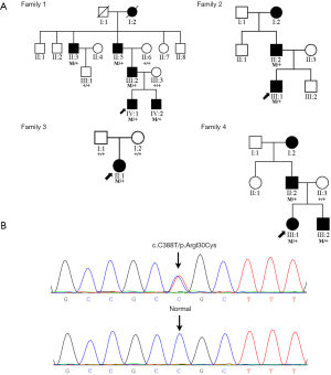 The LIM2 gene encodes the second most abundant lens-specific integral membrane protein, also known as MP19 or MP20. It is a member of the PMP-22/EMP/MP20/claudin (Pfam00822) family of proteins, with roles in intercellular adhesion and protein trafficking (28). To date, four variants of LIM2 have been reported to be associated with the CCs. Three variants (p.Gly78Asp, p.Phe105Val and p.Gly154Glu) are inherited in an autosomal recessive mode (23,29,30). The other mutation reported was p. Arg130Cys, which is inherited in an AD pattern (22). To date, all four mutations have been described as associated with congenital or presenile cataracts. The morphologies of cataracts can be cortical sutural, nuclear and pulverulent. In the present study, four Chinese families in our CCs database (130 unrelated families in total) with the same p.Arg130Cys mutation in the LIM2 gene were detected. Other than CC, patients in these four families featured various ocular phenotypic manifestations, including elongated axial length, myopia-related fundus changes, congenital nystagmus, esotropia, and persistent fetal vasculature (PFV). All specific information of the patients in this report was deidentified. We present the following article in accordance with the STROBE reporting checklist (available at http://dx.doi.org/10.21037/atm-20-4275) as an observational study to explore the genotype-phenotype relationships in the four families with a common candidate variant.