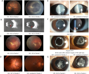 In family 1, all patients were diagnosed with bilateral cataracts before the age of 10 years. IV:1 was the proband. He was referred to the ophthalmic department for bilateral leukocoria at 4 months of age and was diagnosed with nuclear cataracts. His cataract phenotype was bilateral nuclear cataract surrounded by pulverulent cortical opacity. After undergoing cataract extraction and intraocular lens implantation surgery at 6 months, he was diagnosed with elongated axial length (23.17 mm OD, 23.07 mm OS), leopard-shaped fundus and optic disc tilt in both eyes at the age of 4 years and 5 months. IV:2 was the younger brother of IV:1. Differing from the nuclear cataract phenotype of IV:1, he had bilateral lamellar cataracts with a relatively transparent central area. He also had myopia-related fundus changes, including patchy chorioretinal atrophy and optic disc tilt. In addition, there were plaques of remnant tissue sitting on the posterior face of the bilateral lens of IV:2. He was diagnosed with PFV at when he was 7 months old. The fundus photo and B-ultrasound scan of IV:2 are shown in Figure 2A (right panel) and Figure 2B. III:2 is the father of IV:1 and IV:2. He was diagnosed with bilateral cataracts and had cataract surgery when he was 5 years old. His right eyeball was atrophied. The axis length of his left eye was within normal limits (23.86 mm) when he was 35 years old. Nevertheless, he had severe leopard-pattern changes and an oval and tilt optic disc in the fundus of his left eye (Figure 2A, left panel). II:5 was the grandfather of IV:1, and II:3 was the elder brother of II:5. Both II:3 and II:5 had bilateral CCs, elongated axial length, posterior patchy chorioretinal atrophy and optic disc tilt (Figure 2C). The axial lengths of both eyes of II:3 and II:5 were longer than 31 mm. Other ocular phenotypes observed in family 1 include bilateral congenital nystagmus (II:3, IV:1, and IV:2) and intermittent esotropia of the left eye (IV:1 and IV:2).
