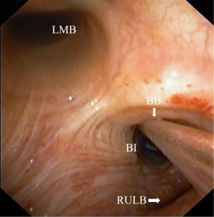 In group C, the left main bronchus diameter was measured by preoperative chest computed tomography. The 35F left DLT was selected when the diameter ≤11 mm, the 37F DLT, was used for 11–12 mm, and the 39F DLT was used for >12 mm. After intubation, pediatric fiberoptic bronchoscopy (FOB) was applied for appropriate position confirmation. In group M, the ID 8-mm tracheal tube was selected for male patients, and the ID 7.5-mm tracheal tube was selected for female patients. After intubation, FOB was applied to measure the tracheal tube’s depth to ensure that the tip of the tube was placed 3–4 cm away from the main carina. The BB’s cuff was placed in the bronchus intermedius with the guidance of FOB (Figure 1). The cuff position was reconfirmed by auscultation in both groups. All procedures were performed by an attending anesthesiologist who had experience in 10 cases for each method. Also, we recorded the time between the start of the tracheal intubation to the end of lung isolation confirmation.
