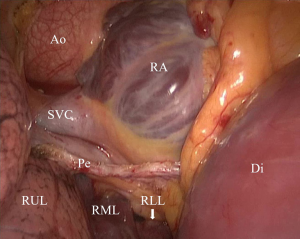 For pleurectomy to commence, apnea had to last for 1 min in both groups, and the bronchial cuffs in both groups were then inflated to start lung isolation. After the retractor was fixed between the ribs, group M’s surgical field exposure was evaluated (Figure 2). If the inflated right upper lobe affected the ascending aorta and aortic root’s surgical exposure, mechanical ventilation was suspended for pericardial traction (if hypoxemia occurred during this period, manually controlled DLV with a small tidal volume was applied to assist the pericardial traction). The surgical field exposure was reassessed after restarting mechanical ventilation. If the exposure was still unsatisfactory, the SLB was changed to right lung isolation (Figure 3). Times of intraoperative dislodgement or loss of seal were also recorded.