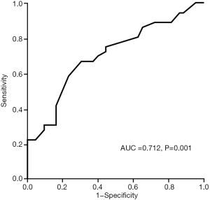 In univariate analyses, a higher edema index, low phase angle, higher intraoperative fluid infusion, and more extensive surgery (higher number of resected segments) were significant risk factors for ascites or AKI in patients who underwent liver resection. However, liver cirrhosis and sarcopenia were not significant risk factors for postoperative ascites or AKI. Specifically, there was a significant difference in the mean values of the edema index (0.387 vs. 0.381, P<0.001) between the groups with and without ascites or AKI. Based on the median value of the edema index, the incidence of postoperative ascites or AKI was higher in patients with a high edema index (>0.384) than in those with a low edema index (≤0.384) (64.9% vs. 31.4%, P=0.001). In multivariate analysis, edema index >0.384 [odds ratio (OR) 3.96; 95% confidence interval (CI): 1.03–15.17; P=0.045] and higher fluid infusion during surgery (OR 1.36; 95% CI: 1.04–1.79; P=0.026) were significant risk factors for postoperative ascites or AKI (Table 2). The AUC of edema index was 0.712 (95% CI: 0.595–0.829; P=0.001) for predicting postoperative ascites or AKI (Figure 1). The edema index proved to be sensitive (68.6%) and specific (70.5%) when using cutoffs as edema index >0.384.