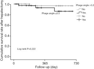 Four patients died during follow-up. Multivariate analysis showed that a large tumor size was the only predictive factor for poor survival after hepatectomy (hazard ratio 1.72, 95% CI: 1.05–2.83; P=0.033). Phase angle, sarcopenia, and edema index were not predictive of survival (Table 5, Figure 2).