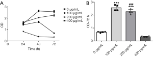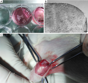 SD rats (weight: 180–200 g; 6 weeks old) were purchased from Experimental Animal Center of the Fourth Military Medical University (Xi’an, China). Chondrocytes from the SD rats were applied to hydrogel spheres (2% alginate + 1% sodium hyaluronate) at a cell density of 4×105 cells/mL (Figure 3A,B). The chondrocytes/spheres were cultured for 48 hours in basal medium with or without 100 µg/mL TIIA. According to our previous study (25), the concentration of 100 µg/mL is effective for inhibiting chondrocyte dedifferentiation.