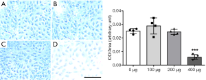 In groups B and C, dark staining of Alcian blue indicated that more GAG was produced at the concentration of 100–200 µg/mL TIIA. In contrast, in group D, Alcian blue staining was light with the concentration of 400 µg/mL TIIA (P<0.05) (Figure 6).