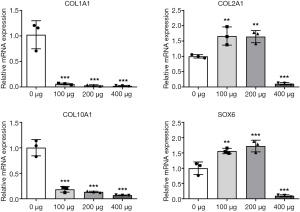 Chondrocytes were harvested from the knee joints of SD rats using the collagenase digestion method. Cells were resuspended in Dulbecco’s Modified Eagle Medium (DMEM, Gibco, USA) supplemented with 10% fetal bovine serum (FBS, Gibco) and cultured at 37 °C with 5% CO2. When cells reached 70–80% confluency, adherent cells were trypsinized, harvested, and further expanded to passage 4 (P4). Chondrocytes (P4) were then cultured in basal medium with various concentration of TIIA for further experiments as follows: (I) group A: cultured in basal medium; (II) group B: cultured in basal medium with TIIA (100 µg/mL); (III) group C: cultured in basal medium with TIIA (200 µg/mL); (IV) group D: cultured in basal medium with TIIA (400 µg/mL). The basal medium contained high glucose DMEM, 10% FBS, and 1% penicillin/streptomycin (P/S, 100 U/mL). All reagents were of analytical grade and the other non-specified reagents were form Solarbio (Solarbio, China).