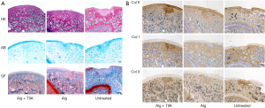 In contrast, in group B, the subchondral bone was repaired incompletely, with less hyaline-like cartilage formation. The defect region was mostly filled with loose fibrotic tissue, and the surface was not smooth. In group C, a large blue-stained area was observed, which lacked normal cartilaginous structure. Higher levels of Col I and Col X, and a lower level of Col II, were also observed. These histological features indicated that pre-treatment with TIIA was beneficial for cartilage damage repair.