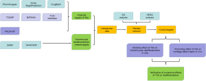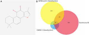 The structure of TIIA (Figure 2A) was obtained from PubChem (https://pubchem.ncbi.nlm.nih.gov/). According to this structure, several databases including Pharmmapper (http://www.lilab-ecust.cn/pharmmapper/) (17), Swiss Target Prediction (http://www.swisstargetprediction.ch/) (18), and Drug bank (https://www.drugbank.ca/) (19) were used to obtain as many potential targets as possible. Thereafter, pharmacokinetic properties including absorption, distribution, metabolism, and excretion (ADME) were determined as the key contributors affecting bioactivities. TIIA was searched in databases including the TCM systems pharmacology database and analysis platform (TCMSP, http://tcmspw.com/tcmsp.php) (20), Bioinformatics Analysis Tool for Molecular mechANism of TCM (BATMAN, http://bionet.ncpsb.org/batman-tcm/index.php/Home/Index/index) (21), and the TCM Database (http://tcm.cmu.edu.tw/) (22), and screened with oral bioavailability (OB) ≥30% and drug-likeness (DL) ≥0.18 as the included criteria. Next, the potential targets of TIIA were collected by text mining with the Pathway Assembly from Literature Mining-an Information Search Tool (PALM-IST, http://www.hpppi.iicb.res.in/ctm/index.html) (23), which is a computational platform for users to explore biomedical literature resources (PubMed) using multiple keywords.