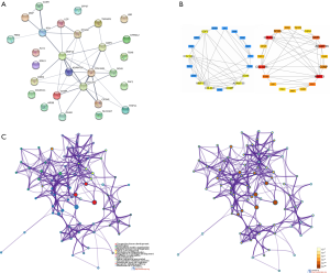 Next, related targets were imported to visualize the interaction network. For modularity analysis, two Cytoscape Network Analyzer plugins, molecular complex detection (MCODE) and CytoHubba, were used. MCODE was based on vertex weighting by local neighborhood density and outward traversal from a locally dense seed protein to isolate the dense regions according to given parameters. The algorithm had the advantage of permitting a directed mode that recognized all possible molecular complexes of particular protein networks. Meanwhile, Cytohubba ranked the nodes according to the attributes in the network, which provided 11 topological analysis methods. Densely connected regions in large protein-protein interaction (PPI) networks that might represent molecular complexes were detected.