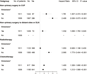 Among the 19,543 patients with CUP, only 34.2% received chemotherapy, and the proportion was even smaller for the administration of radiotherapy (24.3%) or non-primary surgery (14.4%). In the subgroup analysis (Figure 1), among patients either combined with or without metastasis at the bone, brain, liver, and/or lung, surgical procedures to CUP were significantly associated with better survival (P value <0.001), while patients without metastasis showed more benefits (HR =2.495, 95% CI: 2.026–3.073). The use of radiotherapy was only associated with a better outcome in patients without metastasis at the above four sites (P value <0.001). Chemotherapy demonstrated benefits in both groups (P value <0.001).