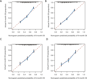 The discrimination performance of nomogram was evaluated through calculating Harrell’s concordance-index (C-index) and drawing 6- and 9-month OS calibration plots of training and validation sets, respectively (10). A higher value of C-index (ranging from 0.5 to 1.0) indicates a better discrimination ability (16). Validations in both cohorts were performed using the bootstrap resampling method.