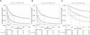 All patients included in the nomogram were stratified into three groups: patients with low risk (33.3%; total score <140), patients with intermediate risk (35.7%; 140≤ total score <180), and patients with high risk (31.0%; total score ≥180) (Figure 4). For all cohorts, the median OS of the low-, intermediate-, and high-risk groups was 28.0 (95% CI: 22.1–33.9) months, 6.0 (95% CI: 5.3–6.7) months, and 2.0 (95% CI: 1.8–2.2) months, respectively. The survival curves demonstrated that the risk stratification based on the nomogram could accurately discriminate the outcome of patients (log-rank test, P value <0.001).
