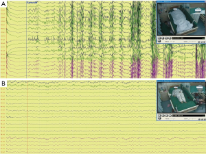 A right-handed 44-year-old woman was diagnosed with epilepsy at the age of 18 years, and over the next 25 years continued to experience multiple focal impaired awareness seizures (FIAS) every month, which mostly evolved into generalized tonic-clonic seizures (GTCS). The patient had a self-reported history of panic attack and anxiety disorder for 10 years, while she had no family history of epilepsy or related disorders. Having therapeutically failed on carbamazepine, phenobarbital and lamotrigine, the patient was referred to our epilepsy center for multi-disciplinary evaluation as a candidate for surgery. Her Hamilton Anxiety Rating Scale (HAM-A) score was 24 admission. Four-day continuous video-EEG monitoring captured three ES, all of right temporal origin (Figure 1A), and two PNES (Figure 1B). According to the patient and her family members, the three ES were typical seizures and two PNES were atypical in terms of semiology.