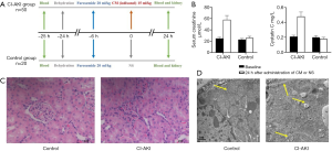 Figure 1 Successful establishment of isotonic CI-AKI rat model. (A) Experimental grouping and operation procedures of establishing the isotonic CI-AKI rat model (CI-AKI group) and control group; (B) serum creatinine (Scr) and cystatin C (Cys C) levels of rats; the measurement data were expressed as mean ± standard deviation; (C) pathological changes of renal tissues of rats detected and evaluated by HE staining (400×; scale bar =25 µm); (D) subcellular changes of renal tissues of rats detected and evaluated by electron microscope. Yellow arrow in control group shows normal mitochondrion. While yellow arrows in CI-AKI group shows glomerular basement membrane thicken and mitochondrion swelling.