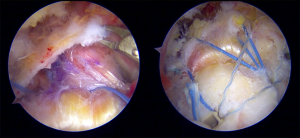 The glenoid side was prepared with the combination of radiofrequency ablation device, arthroscopic shaver, and burr after graft preparation. The remaining labrum should be cleared off from the glenoid surface. The long head of the biceps was usually very frayed and tenotomized. The superior margin of the glenoid was debrided to allow at least 3 suture anchors for fixation (JuggerKnot®, 2.5 mm; Zimmer Biomet, IN, USA or Suturefix Ultra anchor®, 1.9 mm; Smith & Nephew, MA, USA) at the 10, 12, and 2 o’clock positions (Figure 4). Neviaser or accessory portal may be used to assist with the glenoid anchor placement. Care should be taken not to injure the cartilage enface of the glenoid. All soft suture anchors with smaller dimensions were preferred with the argument to avoid suprascapular nerve injury.