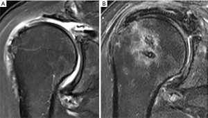 Preoperative imaging assessment using standard shoulder plain radiographs will provide information regarding the presence of arthritic changes of the shoulder joint, the degree of proximal humeral migration, and the acromiohumeral distance (Figure 1). The acromiohumeral distance is best evaluated on an X-ray taken with the beam tilted 20° caudally in anteroposterior projection (41). Magnetic resonance imaging (MRI) may provide information regarding the involved tendons, tear size, and fatty infiltration according to Goutallier’s index (36,42). A detailed assessment on the fatty infiltration of the rotator cuff muscle should be noted on MRI scan. Expert opinion indicated that rotator cuff tears with severe chronicity with respect to the corresponding fatty infiltration “can be arthroscopically repaired” (43). An increased fatty infiltration of the infraspinatus muscle was shown to have a negative effect to the prognosis of SCR (44). However, the status of fatty infiltration of the supraspinatus muscle did not indicate any relationship with the prognosis of SCR. Studies have reported that MRI is not a reliable predictor of rotator cuff repairability (45,46). Nevertheless, it is unclear as to what extent that MRI can predict the success of rotator cuff tear repair.