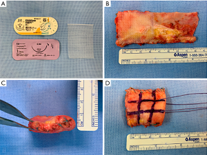 An ipsilateral fascia lata graft was harvested and prepared as a double-folded, 2-layered graft. To allow space for suture and knot tying, a 5-mm length was added to the final size of the graft. It is preferred to reinforce the graft construct by inserting a single layer of polypropylene mesh (Prolene Mesh®; Ethicon Inc, NJ, USA) into the folded fascia lata graft in a sandwich fashion (Figure 3). A running stitch no. 2-0 polyester suture (Ethibond®) was used to seal the graft margin. At least 6-mm-thick graft was obtained during the final graft preparation. The bursal side of the graft was marked to ease the intraarticular orientation of the graft position. A pair of heavy suture was added at the humeral side of the graft to facilitate the graft shuttling and tensioning. A saline-soaked gauze was used to cover the graft while waiting for shuttling. A routine local anesthetic injection was given to the donor site after a formal closure.