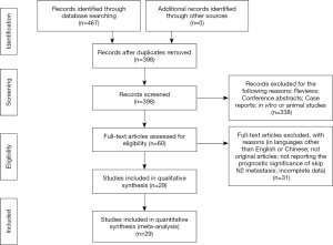A total of 398 articles were found from the initial search after discarding duplicates. Following a review of titles and abstracts, the full texts of 60 papers were assessed. All reviews, conference abstracts and case reports were excluded from our analysis, yielding 29 articles for inclusion. The selection process is depicted in Figure 1. The baseline characteristics of all included articles are shown in Table 1. The included studies were all retrospective. The articles compared the prognostic effect and clinicopathologic difference between patients with skip metastasis and non-skip N2. A total of 1,806 patients with skip N2 metastasis and 4,670 patients with N1 positive mediastinal metastasis were included in our study, while 3 articles did not report the exact number of the patients in each group (2,15,16). The publication years spanned 1996 through 2019. Only one article underwent propensity score matching to adjust the baseline characteristics between two groups (17). Quality assessment by NOS is reported in Table 1.