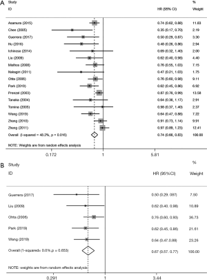 The association between skip metastasis and overall survival was reported in 16 studies. Skip metastasis was found to be associated with significantly better overall survival (HR =0.74, 95% CI: 0.66–0.83, P<0.001, I2=48.2%) compared with non-skip metastasis (Figure 2A). A subgroup analysis was conducted among articles that reported intrapulmonary lymph node dissection, and the result showed similar outcome with no heterogeneity (HR =0.67, 95% CI: 0.57–0.77, P<0.001, I2=0) (Figure 2B). Similar results were observed in different subgroup analysis of the favorable prognosis in skip metastatic patients (Table 2). Additionally, skip metastasis was also correlated with better disease-free survival or recurrence-free survival compared with non-skip metastasis (HR =0.71, 95% CI: 0.61–0.84, P<0.001, I2=18.2%) (Table 3).