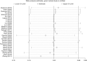 Sensitivity analysis was conducted by omitting each study sequentially when assessing overall survival. A consistent result was found among all studies (Figure 3). Publication bias was assessed with Begg’s test and a significant publication bias was observed in overall survival with Begg’s weighted regression method (P=0.034).