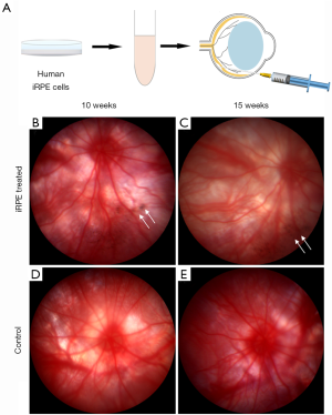 Color fundus photographic imaging was performed to observe the placement of transplanted cells in vivo. The photographs on the 10th week after transplantation showed that dark pigments occurred near the optic disc and remained until 15 weeks after surgery (Figure 5B,C), while a similar phenomenon was not found in the eyes of the sham control group at either time point (Figure 5D,E). The images demonstrated that human iRPE cells were successfully transplanted into RCS rats and survived for at least 3 months.