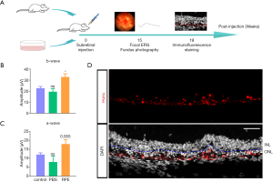 Focal electroretinogram (ERG) was used to assess focal retinal function by manual instruments (Phoenix Research Labs). After dark adaption overnight, RCS rats were anesthetized using chloral hydrate (300 mg/kg) with the pupils dilated using compound tropicamide eye drops. Three separate electrodes were used: the head electrode and the ground electrode were fixed onto subcutaneous tissue of the forehead and tail, respectively, and another ring electrode was embedded in the cornea contact lens. The RCS rats were placed on a heating pad to keep the body temperature from dropping. ERG was carried out under dark-adapted conditions.