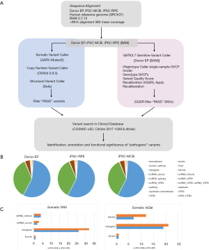 A 150 bp paired-ended whole-genome sample sequencing library was prepared and sequenced on an Illumina X Ten platform with 50X coverage. The clean data were produced by filtering raw data. All clean data from each sample were mapped to the human reference genome. Burrows-Wheeler Aligner (BWA v0.7.15) software was used to perform the alignment. Single-sample genomic variations, including single nucleotide polymorphisms (SNPs) and small insertions or deletions (InDels), were detected by HaplotypeCaller of GATK (v3.7) following the recommendation of best practices for variant analysis with the Genome Analysis Toolkit (GATK, https://www.broadinstitute.org/gatk/guide/bestpractices). iRPE vs. Donor EP and iPSC MCB vs. Donor EP somatic variant calling were performed with GATK Mutect2. In addition to SNPs and InDels, copy number variants (CNVs) were called with CNVKit (v0.9.3), and structural variants (SVs) were called with Delly (v0.8.3). All variant annotations were performed with ANNOVAR. The variants were filtered with a variety of databases, such as COSMIC, ClinVar and dbVar.