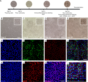 Human iRPE cells were thawed and maintained on vitronectin-coated 6-well plates and were identified at several time points (Figure 3). On the second day (D2) after recovery, most iRPE cells showed an immature fusiform or oval appearance (Figure 3B). Over time, typical clusters with a cobblestone morphology were observed on D8 (Figure 3C). With continued progress, the iRPE cells exhibited the appearance of mature, tight-junction and hexagonal monolayer epithelium with slight pigmentation. The cells were allowed to culture for an additional several days and used for further analysis or transplantation (Figure 3D). After induction for 25 days, the iRPE cells were matured with brown pigmentation (Figure 3E). To identify iRPE before transplantation, we confirmed the expression of RPE-specific proteins, including RPE65 and MiTF, which are required for retinoid recycling and melanogenesis, with immunofluorescence staining (Figure 3G,L). ZO-1 was also positive on the lateral margins of the mature iRPE cells (Figure 3H-J). After maintenance for 25 days, human iRPE cells presented pigments and RPE-specific protein expression.