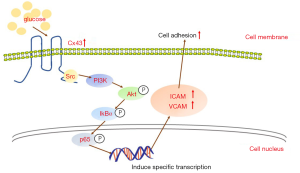 Like a cell membrane reactive protein, the carboxyl-terminal domain of Cx43 not only contains some phosphorylation sites itself but also interacts with some special elements of cellular signaling pathways, such as NF-κB, Wingless/Integrated (Wnt), and Src, which has been demonstrated that Cx43 expression alternation could influence its downstream signaling pathways (15). Cx43 expression on membranes mediates the effective signal transduction from extracellular to intracellular. Numerous studies have reported that the NF-κB signaling pathway involves a variety of inflammatory processes that can interact with Cx43 (29,30). Moreover, the NF-κB signaling pathway is also reported to play a key role in regulating the expression of adhesion-related molecules, including ICAM-1 and VCAM-1. Besides the activity of NF-κB can be manipulated through the PI3K/AKT signaling pathway (31,32), we explored the interaction between Cx43 and the PI3K/AKT/NF-κB signaling pathway in monocyte-endothelial adhesion and the effects of hyperglycemia in this process. Our results show that hyperglycemia can result in the activation of the PI3K/AKT and NF-κB signaling pathways via the regulation of Cx43 expression in HUVECs. With the activation of the PI3K/AKT and NF-κB signaling pathways, the adhesion-related molecules ICAM-1 and VCAM-1 become up-regulated, resulting in increased monocyte-endothelial adhesion.