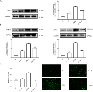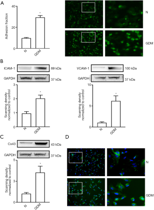 Changes of Cx43 expression on GDM-HUVECs affected hyperglycemia-induced cell adhesion and ICAM-1/VCAM-1 expression.