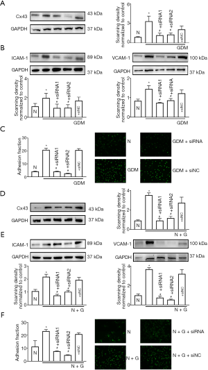 Two specific siRNAs (siRNA1 and siRNA2) targeting Cx43 were designed to knock down Cx43 expression in GDM-HUVECs. The results show that as Cx43 was knocked down specifically, hyperglycemia-induced cell adhesion, and ICAM-1 and VCAM-1 expression were markedly reduced (Figure 3A,B,C, P<0.05). Also, Figure 3D shows that these two siRNAs could also attenuate Cx43 expression in HUVECs induced by high exogenous glucose (30 mM, 7 days). More importantly, the increases in cell adhesion and ICAM-1 and VCAM-1 expression that were stimulated by exogenous high glucose (30 mM, 7 days) were observed to be decreased with the down-regulation of Cx43 (Figure 3D,E,F, P<0.05).